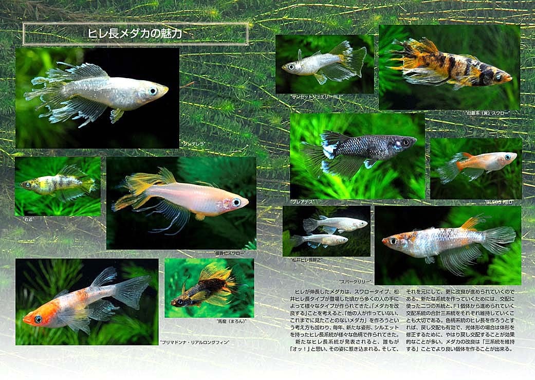 今日、500品種、系統を超える改良メダカの特徴をテーマ別にまとめて紹介するMedaka Advance Guideのシリーズを2026年1月より開始しました。その第一弾がヒレ長メダカです。リアルロングフィン、松井ヒレ長、スワローなど様々なヒレ長メダカが知られるようになり、2026年1月には光体形で太いスワロー系のヒレ長を持つ“シンデレラ”がリリースされました。そのヒレ長メダカの魅力に触れてください。