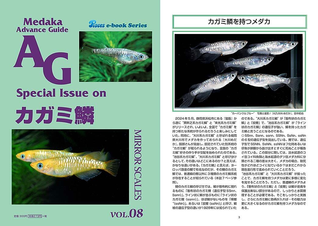 2024年5月に“池谷カガミ鱗”がリリースされてから、“大川系カガミ鱗”も続いてリリースされ、鱗が大きく変化するカガミ鱗を持つメダカの面白さが倍増しました。そのカガミ鱗についてを27ページオールカラーでまとめた一冊です。遺伝子情報が多めで、改良メダカの中級者以上向けの内容かと思いますが、誰でも写真をご覧いただければ、カガミ鱗の面白さを知っていただけるかと思います。